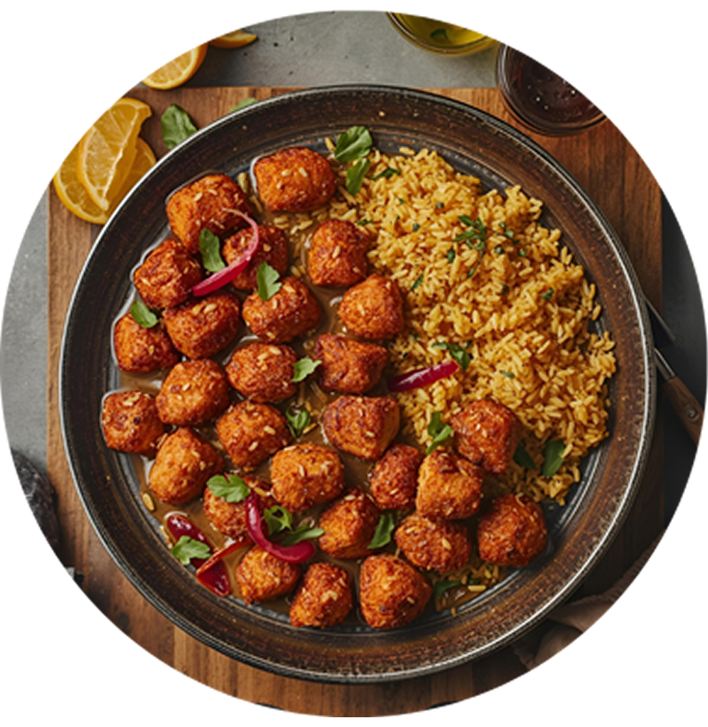 Smoky party jollof rice meets juicy, fire-grilled chicken, finished with caramelised plantain and a bright pepper reduction.