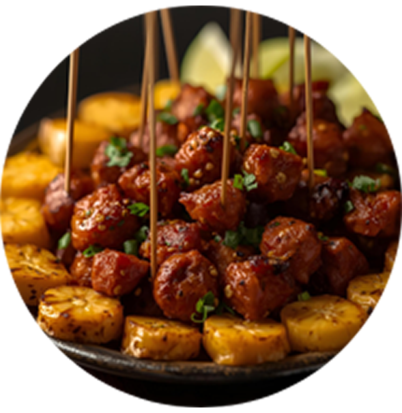 Thin-sliced beef is marinated and grilled over live coals, then coated in our house yaji—roasted groundnut, chile, ginger, and secret aromatics—for an irresistible smoky heat. We serve it with ripe dodo, fresh kuli-kuli crumble, and crunchy onions for snap. Perfect bar bites for the lounge, great with a chilled mocktail, and available in beef, chicken, or fish on request.